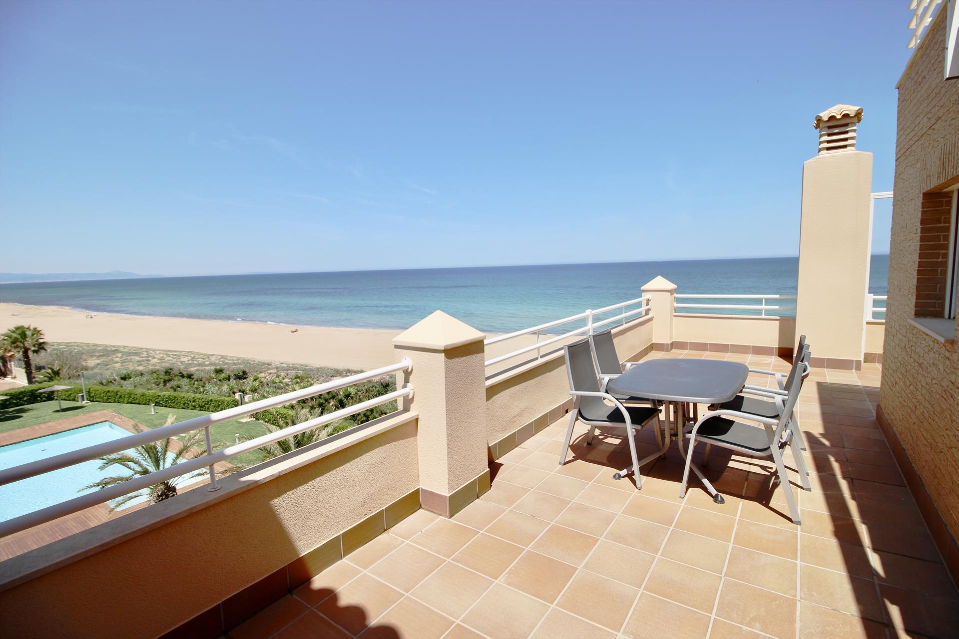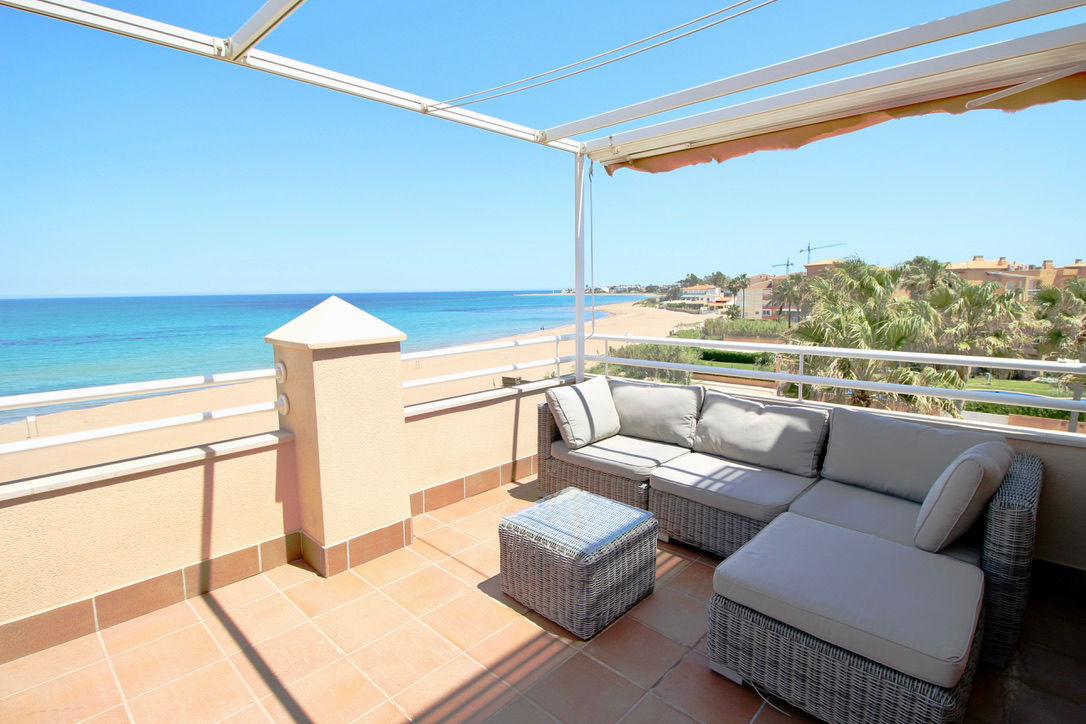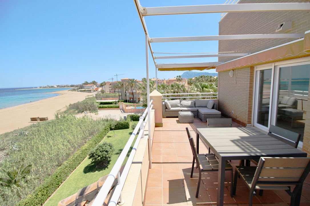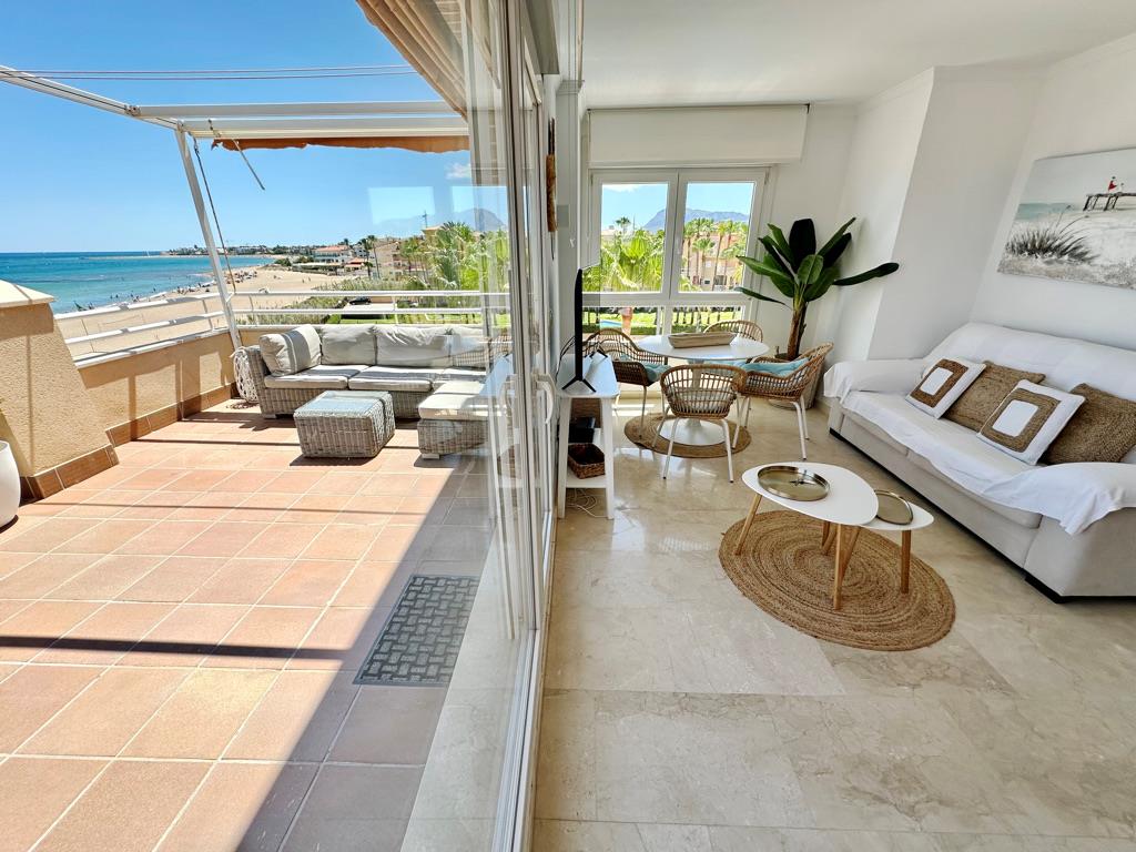 Ático piscina privada en primera línea de playa con vistas al mar. Muy bien situado en complejo muy valorado por los turistas. Todo exterior. Moderno. Muy equipado. Grandes terrazas. Garaje. Piscina comunitaria abierta todo el año. Jardín muy cuidado. Acceso directo a la playa de arena fina. Zona muy tranquila. Mucha privacidad en la playa. Ideal para familias. Todos los servicios cerca: restaurantes, supermercados. Situado en la famosa playa de las marinas muy cerca de Denia. Línea regular de autobús para ir a Denia.