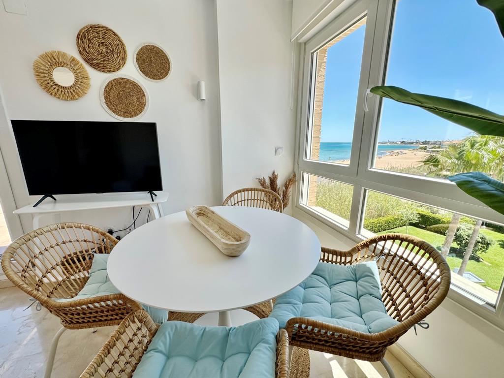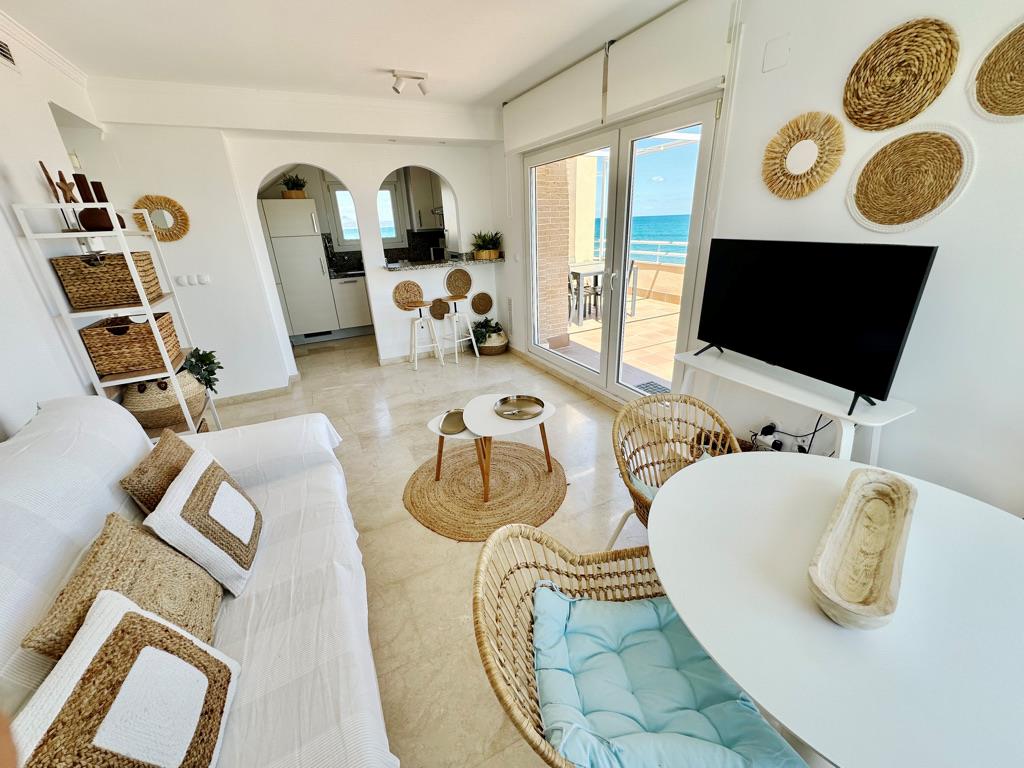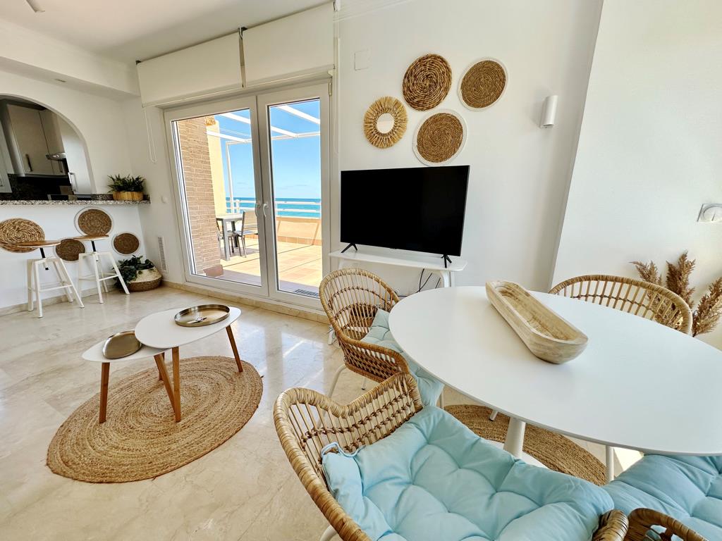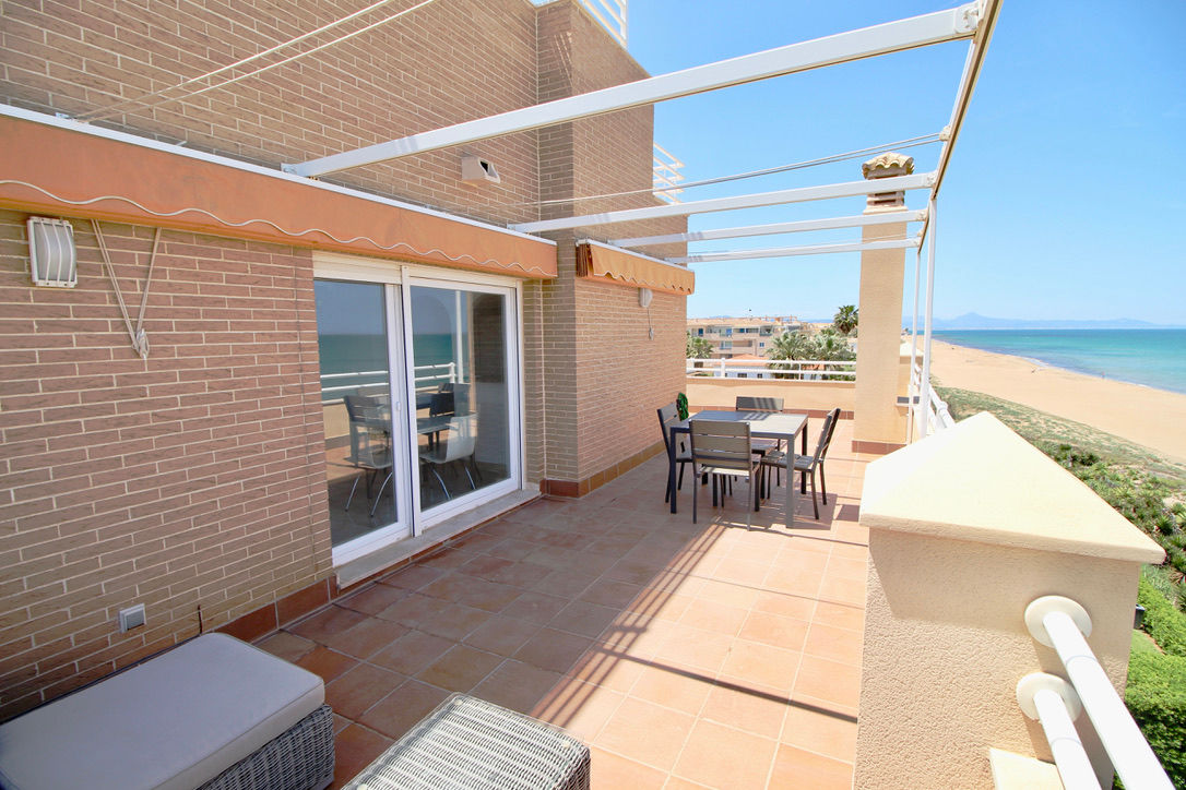 Ático piscina privada en primera línea de playa con vistas al mar. Muy bien situado en complejo muy valorado por los turistas. Todo exterior. Moderno. Muy equipado. Grandes terrazas. Garaje. Piscina comunitaria abierta todo el año. Jardín muy cuidado. Acceso directo a la playa de arena fina. Zona muy tranquila. Mucha privacidad en la playa. Ideal para familias. Todos los servicios cerca: restaurantes, supermercados. Situado en la famosa playa de las marinas muy cerca de Denia. Línea regular de autobús para ir a Denia.