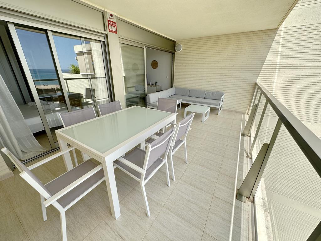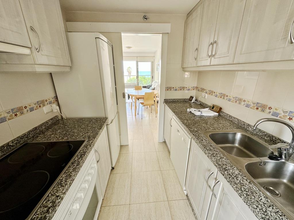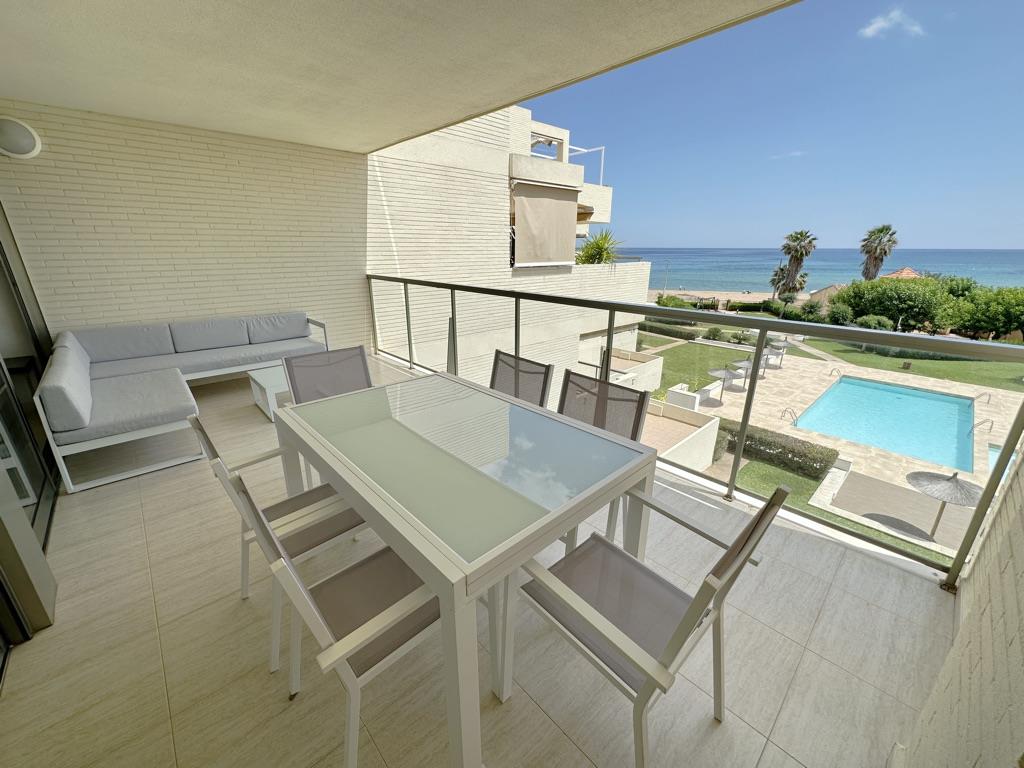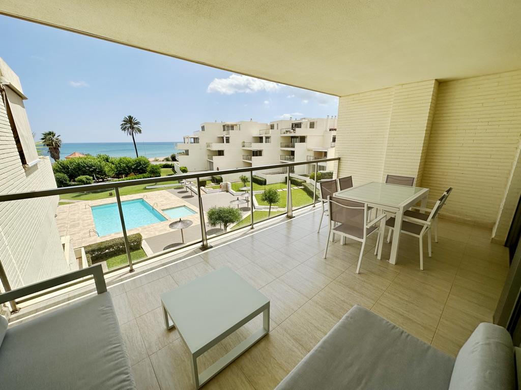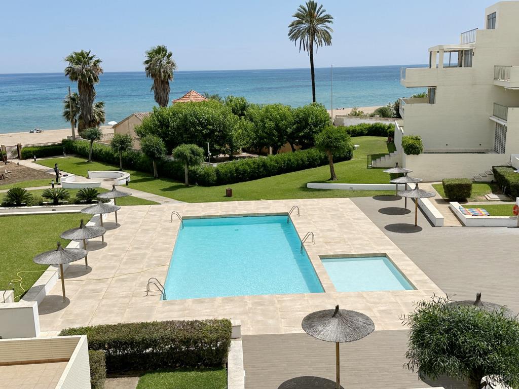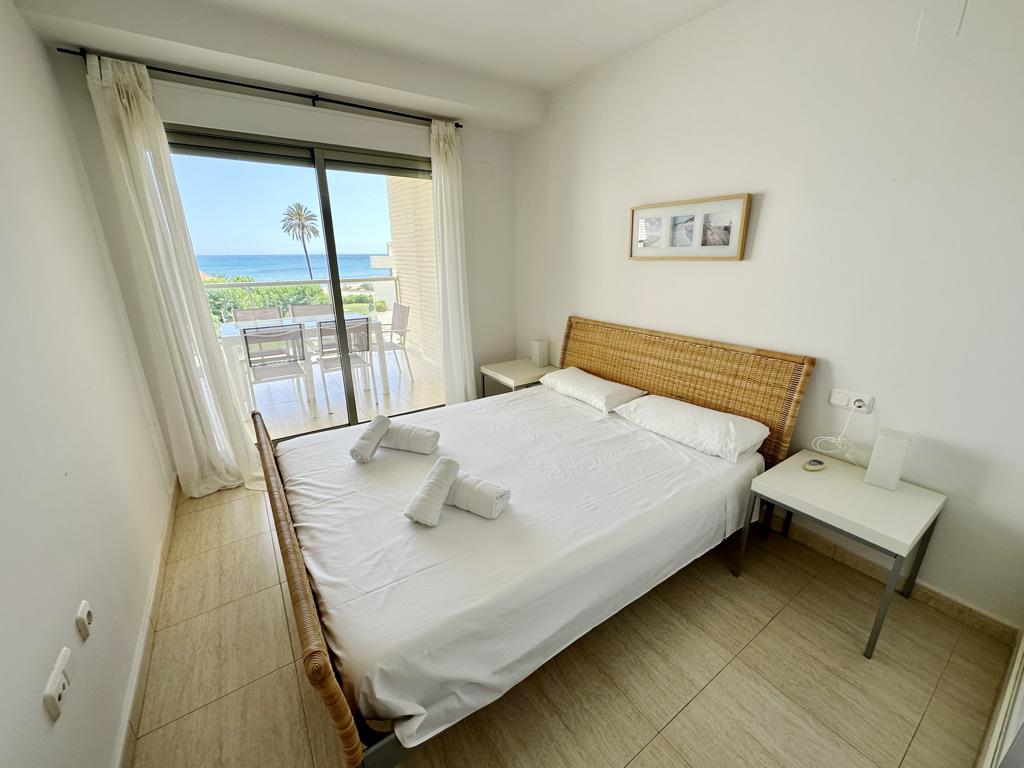 Apartamento en primera línea de playa con vistas al mar. Muy bien situado en complejo muy valorado por los turistas. Todo exterior. Moderno. Muy equipado. Grandes terrazas. Garaje. Piscina comunitaria abierta todo el año. Jardín muy cuidado. Zona de juego para niños. Acceso directo a la playa de arena fina. Zona muy tranquila. Mucha privacidad en la playa. Ideal para familias. Todos los servicios cerca: restaurantes, supermercados. Situado en la famosa playa de las marinas muy cerca de Denia. Línea regular de autobús para ir a Denia.