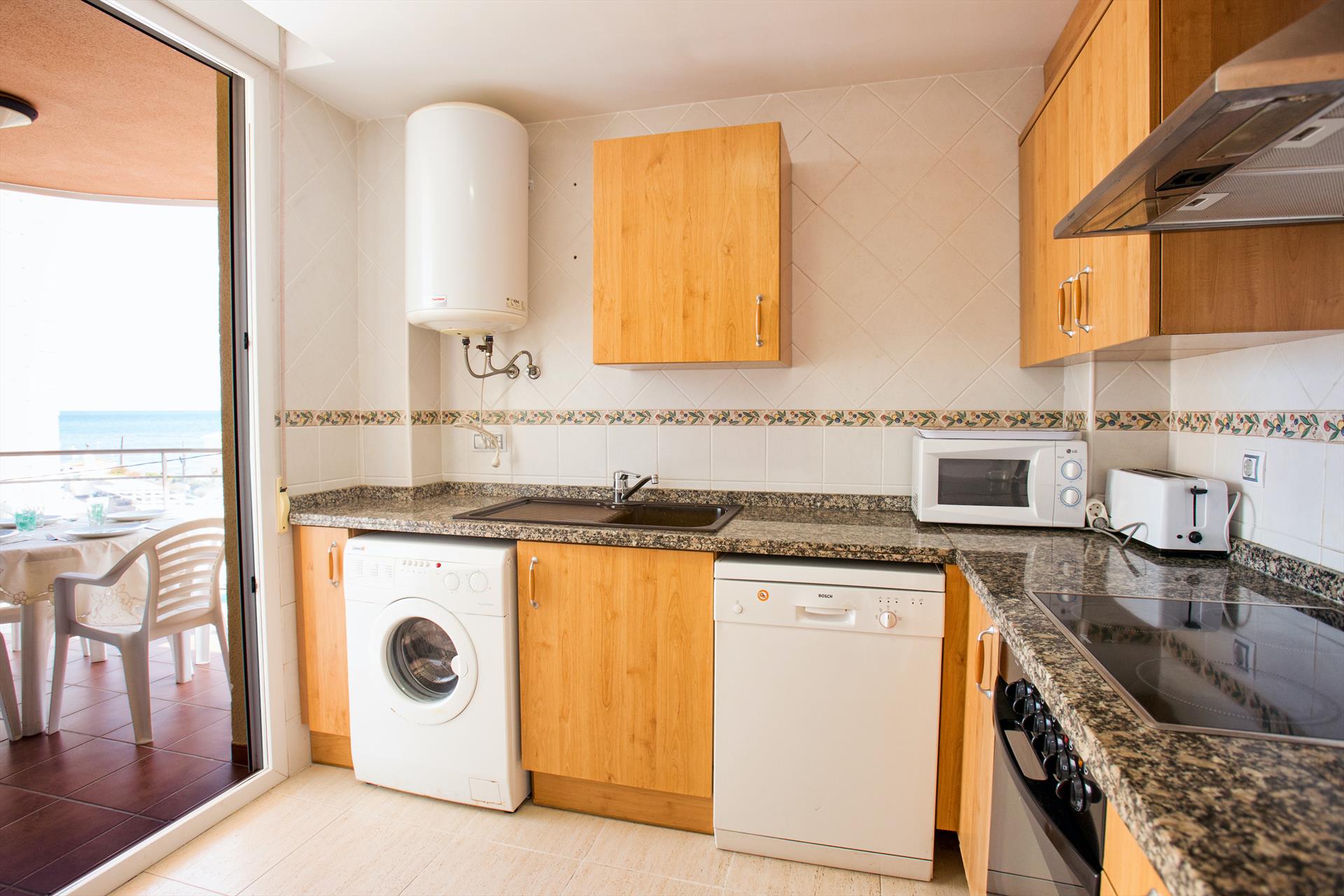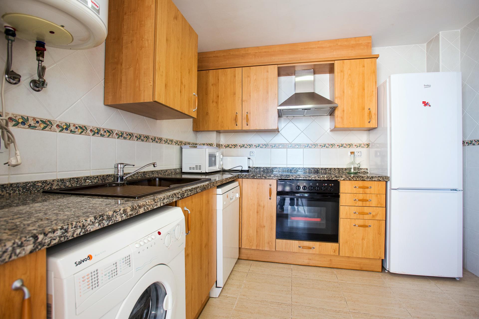 • cocina con cocina eléctrica, horno eléctrico, microondas, lavavajillas, refrigerador-congelador, cafetera, calentador de agua, batidor, tostador y licuadora