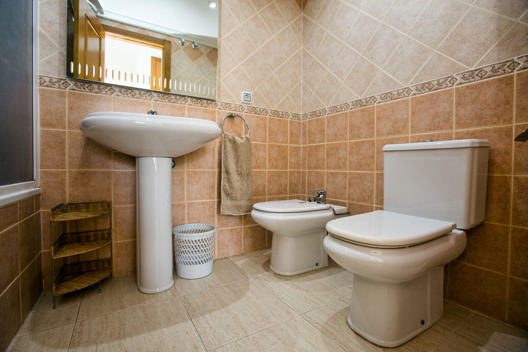 • cuarto de baño con lavabo, bañera, ducha, bidet, inodoro y secadora de pelo