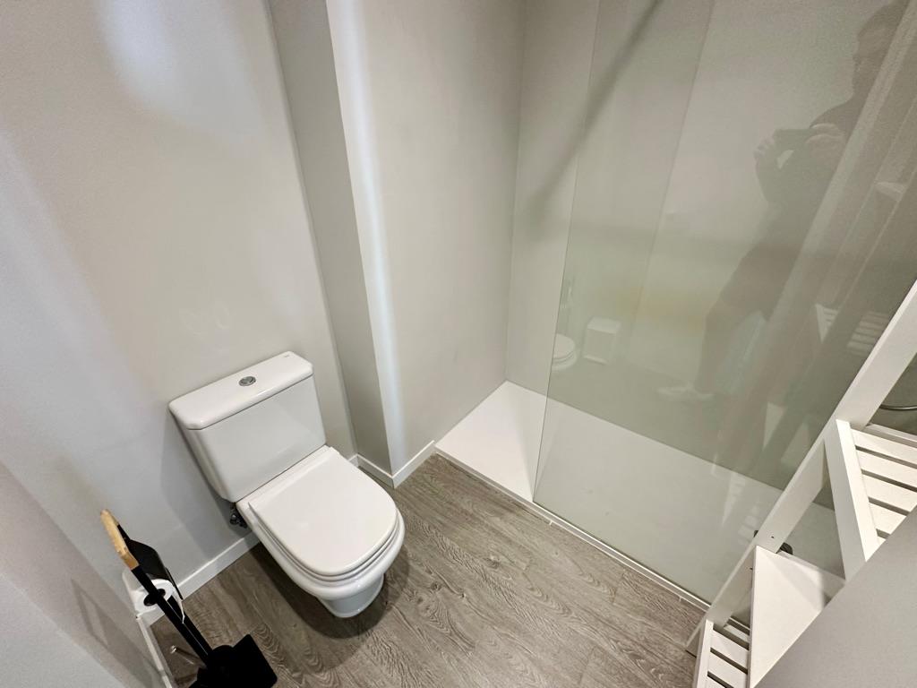 • bathroom with single washbasin, shower and toilet